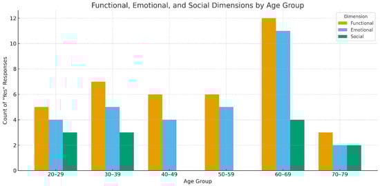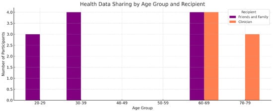 Figure 3 presents a comparative analysis of health data sharing behavior segmented by age group and recipient type (friends/family vs. clinicians). Participants aged 60–69 exhibited the most diversified sharing behavior, reporting interactions with both personal and professional recipients. Interestingly, the 70–79 age group showed a preference for clinical sharing over social, while younger cohorts predominantly shared health data with friends and family. These trends are consistent with previous findings highlighting generational differences in data privacy concerns and trust in digital health platforms [7,10].