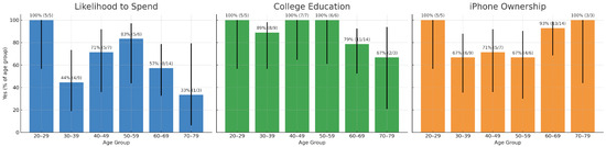 High activity appears in multiple age bands (20–29, 50–59, 60–69). While this seems to contradict a simple monotonic age–activity hypothesis, the pattern is consistent with a bimodal engagement phenomenon in consumer health tech where (i) younger adults and (ii) motivated older adults both maintain high activity tracking [42,59].
