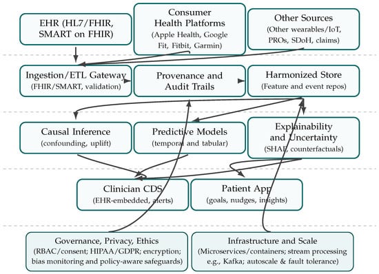 The novelty of our work lies in bridging these persistent gaps through a unified, AI-driven framework explicitly grounded in patient and stakeholder feedback. Whereas prior systems emphasize technical interoperability or algorithmic performance, our approach integrates three dimensions: (i) multimodal data fusion across EHRs, wearables, and PROs; and (ii) usability-centered design informed directly by qualitative insights from diverse user groups. This transition from qualitative findings to system design ensures that the framework is not only technologically advanced but also aligned with patient trust, provider workflow integration, and equity considerations. By embedding stakeholder perspectives into system architecture, this study advances digital health beyond interoperability alone, toward context-aware, participatory, and preventive care delivery.