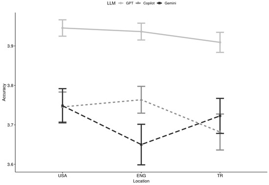 Accuracy x Location: Accuracy scores were consistently high across LLMs, domains, and locations, with means ranging from 3.63 to 3.97 on the 4-point scale (see Table 1). ChatGPT produced the highest accuracy overall, while Copilot yielded the lowest, with Gemini falling in between. For instance, ChatGPT scores were stable across locations (USA: M = 3.97; England: M = 3.94; Türkiye: M = 3.93), whereas Copilot trailed slightly (USA: M = 3.75; England: M = 3.76; Türkiye: M = 3.68). A 2 (Domain category: foundational knowledge vs. practical support) × 3 (LLM: GPT, Gemini, Copilot) × 3 (Location: USA, England, Türkiye) mixed ANOVA revealed a significant main effect of LLM, F(2, 84) = 33.10, p < 0.001, η2 = 0.14, indicating considerable variation in accuracy across the three systems. Domain was not significant, F(1, 42) = 0.10, p = 0.748, and Location showed a marginal effect, F(2, 84) = 3.09, p = 0.051. Importantly, the LLM × Location interaction was significant, F(4, 168) = 4.12, p = 0.003, η2 = 0.012, while all other interactions were nonsignificant. Follow-up analyses demonstrated that Gemini produced significantly lower accuracy than ChatGPT in England, while Copilot also underperformed relative to ChatGPT in some contexts (see Figure 1).