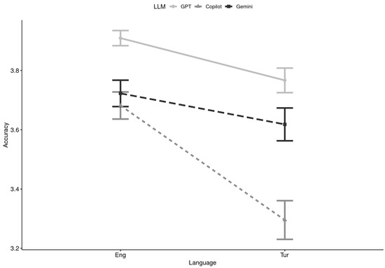A 2 (Domain category: foundational knowledge vs. practical support) × 3 (LLM: GPT, Gemini, Copilot) × 2 (Language: English vs. Turkish) mixed ANOVA revealed a main effect of LLM, F(2, 84) = 35.77, p < 0.001, η2 = 0.17, indicating clear accuracy differences across systems. A main effect of Language also emerged, F(1, 42) = 50.07, p < 0.001, η2 = 0.10, with English queries producing higher accuracy than Turkish ones. Importantly, the LLM × Language interaction was significant, F(2, 84) = 10.65, p = 0.0001, η2 = 0.04, showing that the accuracy gap between systems differed by language. Domain and all other interactions were nonsignificant.