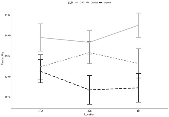 Readability x Location: Analyses of readability using Flesch–Kincaid Grade Level (FKGL) scores indicated consistent patterns across domains and locations. A 2 (Domain) × 3 (LLM) × 3 (Location) mixed ANOVA revealed a significant main effect of LLM, F(2, 84) = 14.75, p < 0.0001, η2 = 0.053. Neither domain, F(1, 42) = 2.64, p = 0.112, nor location, F(2, 84) = 0.12, p = 0.888, reached significance, and no interactions were observed. Multilevel modeling produced a convergent pattern of findings. Likelihood ratio tests supported inclusion of LLM (Δχ2 = 25.08, p < 0.0001), but not domain or location. Fixed-effects estimates indicated that Copilot responses were written at significantly lower grade levels than ChatGPT (β = −1.132, p = 0.015, r = 0.26), suggesting that Copilot produced more accessible content. Gemini responses also trended toward lower readability scores (β = −0.850, p = 0.065), though this difference did not reach significance.