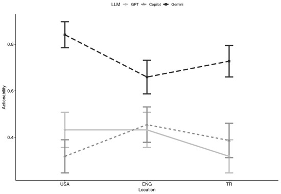 Actionability x Location: Descriptive analyses indicated clear differences among LLMs in the likelihood of generating actionable responses. Gemini consistently produced the highest proportion of actionable content across locations. For example, in the USA, Gemini responses were actionable in 84% of cases (M = 0.84), compared to 43% for ChatGPT and 32% for Copilot. In England, Gemini remained higher (M = 0.66) relative to ChatGPT (M = 0.43) and Copilot (M = 0.45). In Türkiye, Gemini again exceeded ChatGPT and Copilot (M = 0.73 vs. M = 0.32 and M = 0.39, respectively). These descriptive patterns suggest a possible LLM × Location interaction, whereby Gemini’s advantage was robust across countries, while GPT and Copilot fluctuated modestly by setting (see Table 3 and Figure 5).