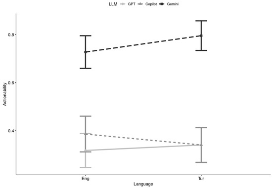 Actionability x Language: When comparing across languages, Gemini again outperformed the other systems (see Table 3 and Figure 6). In English, Gemini responses were actionable 73% of the time (M = 0.73), compared to ChatGPT (M = 0.32) and Copilot (M = 0.39). In Turkish, Gemini was even more likely to provide an explicit user-oriented action (M = 0.80), compared with ChatGPT (M = 0.34) and Copilot (M = 0.34). These findings imply strong main effects of LLM, with Gemini substantially outperforming ChatGPT and Copilot, and only minor variation attributable to language. Domain effects may also be present but were not as visually evident in the descriptive breakdowns.