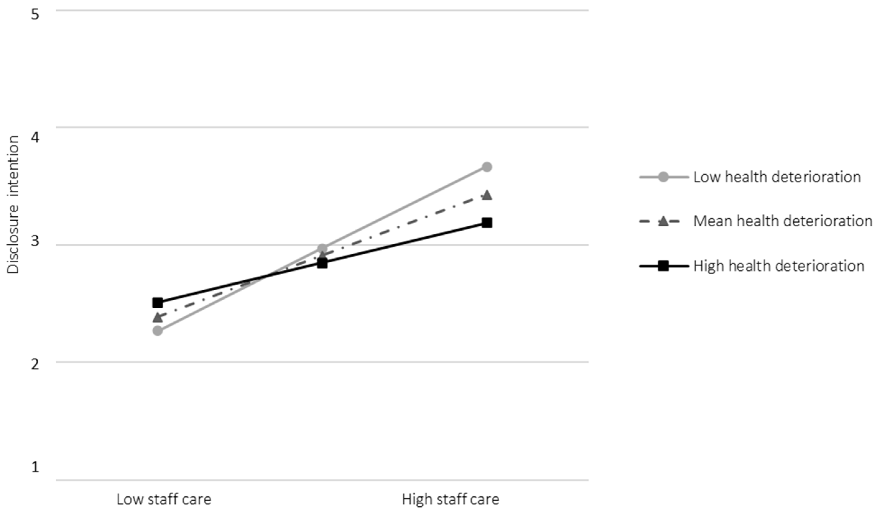 The positive relationship between staff care and disclosure intentions is moderated by employees’ health deterioration. The relationship is weaker at higher levels of health deterioration (i.e., initial warning signals; study 3).