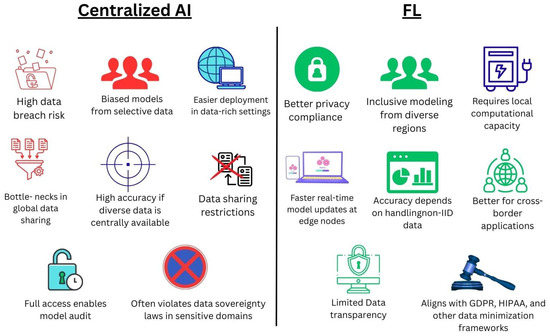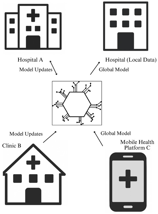 Healthcare data are inherently distributed across hospitals, clinics, mobile health devices, and governmental agencies. These data sources vary in format, volume, and quality, but collectively hold invaluable insights for disease surveillance, personalized prevention, and resource allocation [10]. FL addresses this fragmentation by allowing local nodes, each possessing their own data, to perform model training locally. Only the learned model parameters are shared and aggregated to form a global model. This approach preserves data sovereignty, reduces privacy risks, and facilitates compliance with data protection regulations such as the GDPR and the Health Insurance Portability and Accountability Act (HIPAA) [5,11].