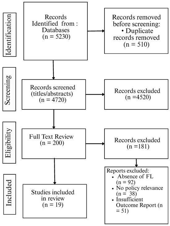 Titles and abstracts of these records were independently screened by two reviewers, resulting in the exclusion of 4520 records based on irrelevance to FL, lack of public health focus, or non-research publication types. Full texts were retrieved for the remaining 200 articles.