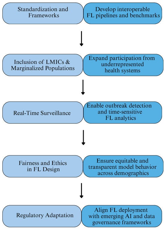 Moreover, FL enhances policy responsiveness in dynamic public health scenarios. For example, during a pandemic, FL could facilitate real-time learning from hospitals, community health centers, and mobile health platforms worldwide, enabling policymakers to make rapid, data-informed decisions while respecting national and institutional data sovereignty. The decentralized nature of FL also aligns well with the principles of distributed public health systems, where decisions are often made at local or regional levels but require coordination and harmonization across broader networks [5,21].