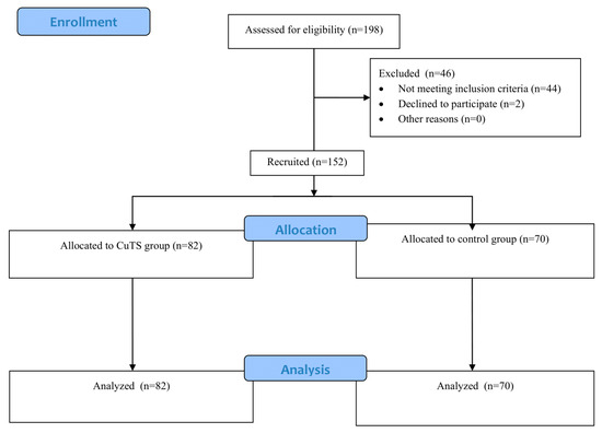 This was a case–control study conducted in the Silesia region of Poland. Patients with CuTS were recruited from several medical clinics between 2022 and 2023 and included in the case group. A total of 198 individuals were assessed for eligibility; 46 were excluded (44 not meeting inclusion criteria and 2 declining to participate). The final study sample comprised 152 participants—82 patients with CuTS and 70 healthy controls. Data from the CuTS group were obtained during baseline assessments of a randomized controlled trial investigating the effects of physiotherapy on CuTS symptoms (ACTRN12621001623886). A flow diagram summarizing the recruitment and inclusion process is presented in Figure 1.