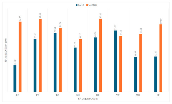 OHS was assessed with the SF-36 questionnaire. The CuTS group had significantly lower scores in most domains compared with the control group, except the bodily pain (BP) domain, where no significant difference was observed. Notably, the vitality (VT) domain showed a statistically significant difference in favor of the CuTS group. Detailed results are presented in Table 2, Table 3 and Table 4.