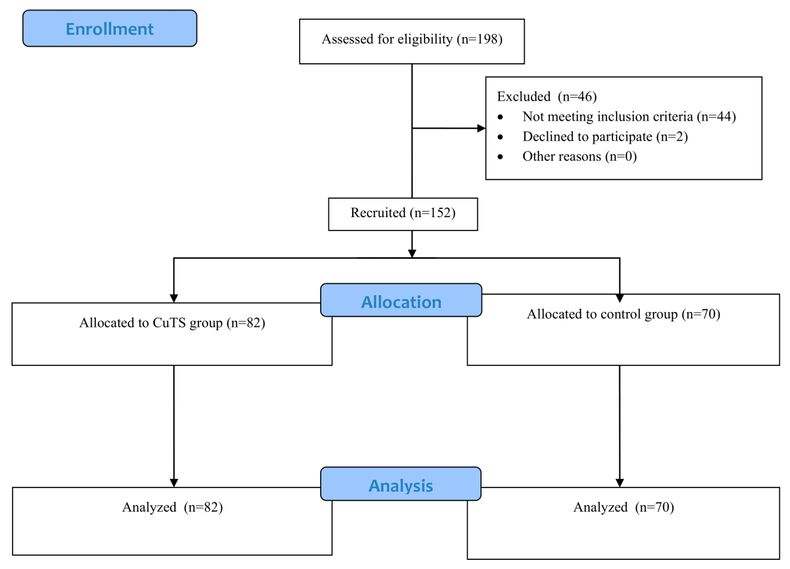 This was a case–control study conducted in the Silesia region of Poland. Patients with CuTS were recruited from several medical clinics between 2022 and 2023 and included in the case group. A total of 198 individuals were assessed for eligibility; 46 were excluded (44 not meeting inclusion criteria and 2 declining to participate). The final study sample comprised 152 participants—82 patients with CuTS and 70 healthy controls. Data from the CuTS group were obtained during baseline assessments of a randomized controlled trial investigating the effects of physiotherapy on CuTS symptoms (ACTRN12621001623886). A flow diagram summarizing the recruitment and inclusion process is presented in