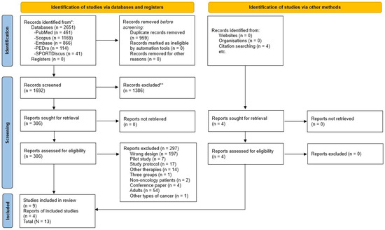 - Battanta, N.K.; Lange, K.; Kesting, S.V.; Marx-Berger, D.; Heesen, P.; Ober, H.; Onerup, A.; Pluijm, S.M.F.; Scheler, E.; Verwaaijen, E.J. Supervised Physical Activity Interventions in Children and Adolescents with Cancer Undergoing Treatment—A Systematic Review. Curr. Oncol. 2025, 32, 234. [Google Scholar] [CrossRef]