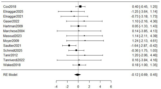 Figure 3 shows the meta-analysis of the dropouts. The estimated average log odds ratio based on the random-effects model was −0.12 (95% CI: −0.69 to 0.45) with a small heterogeneity (I2 = 19.66%), which means a relative reduction of 11.2% in the exercise group compared to the control group. However, the meta-analysis was not statistically significant (p = 0.501).