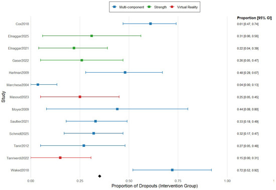 Forest plot for proportion meta-analysis of the dropouts comparing the type of exercise in the intervention group. The figure analyses 8 studies using multicomponent exercise, represented in blue color, 3 studies using strength exercise, represented in green color, and 2 studies using virtual reality-based exercise, represented in red color. The figure shows the point estimates of each study represented by squares with their 95% CIs represented by horizontal lines, and the pooled proportions represented by the diamond. The analysis was conducted using a random-effects model [5,8,16,26,27,28,29,30,31,32,33,34,35].