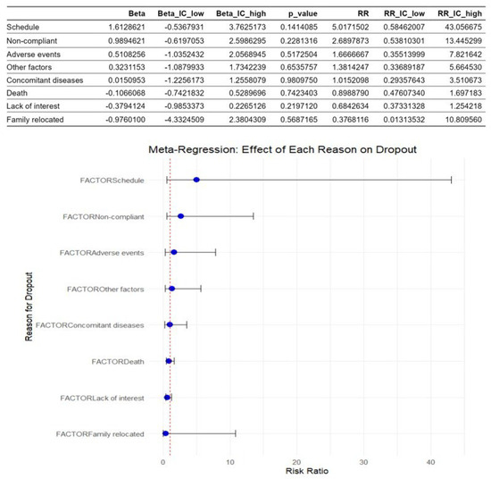 Figure 5 shows the multivariate meta-regression analysis. This revealed that the factors identified as causes of dropouts didn’t moderate dropout rates. The schedule and the lack of compliance were the most influential factors with the highest risk ratio values, but the results were not statistically significant.