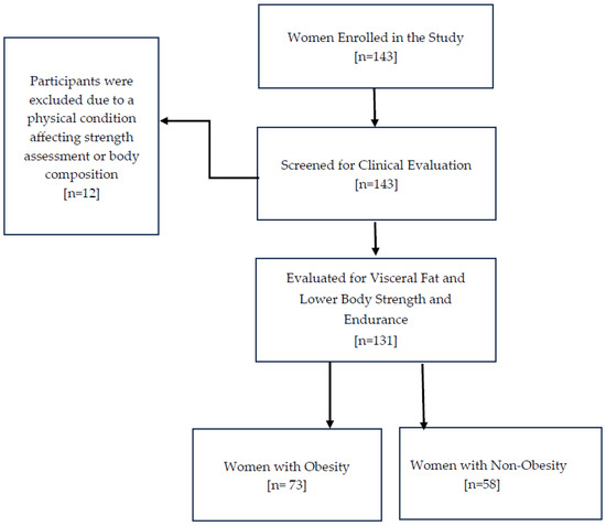 Out of the 143 women initially enrolled in the study, 12 were excluded after screening, leaving 131 women aged 18 to 94 for examination of visceral fat and functional capacity, as shown in Figure 1. Table 1 summarizes the clinical characteristics of the study sample, with the median age being 56 and the interquartile range (IQR) from 45 to 61. Regarding the key variables of interest, the median visceral fat rating (VFR) was 10, with an IQR from 7 to 12, and the median score for the 30 s sit-to-stand test (30CST) was 8, with an IQR from 7 to 10. The study compared these variables between women with obesity (n = 73) and non-obesity (n = 58), using a BMI of 30 kg/m2 as the cutoff for obesity diagnosis. The median VFR values were significantly different between the groups: women with non-obesity had a median VFR of 7, with an IQR from 6 to 9, while women with obesity had a median VFR of 12, with an IQR from 10 to 13. This difference was statistically significant (p < 0.0001), as shown in Figure 2.