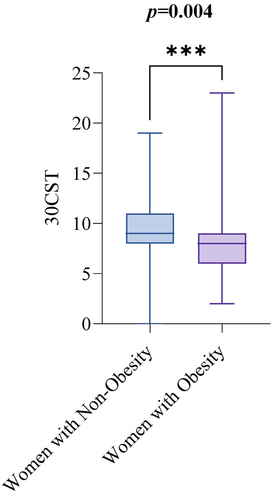 In contrast, women with obesity performed lower on the 30CST than women with non-obesity. The median 30CST score for women with non-obesity was 9, with an IQR from 8 to 11, while for women with obesity, the median score was 8, with an IQR from 6 to 9. The difference was statistically significant (p = 0.0004), as illustrated in Figure 3.