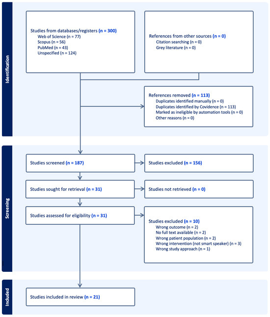 Articles specifically pertaining to adolescents or other population groups that utilized robotics and chatbot technology were systematically excluded from this study. A total of 300 retrieved articles were imported into Covidence and VOSviewer (version 1.6.20) to facilitate screening, data extraction, and subsequent analysis. To ensure reliability and mitigate potential bias, at least two reviewers screened each article at every stage of the review process. The principal investigator acted as a conflict resolver, facilitated the discussion, and rendered the final decision based on group consensus. The review process started with the uploading of articles, followed by the removal of one hundred and three (n = 103) duplicates. One hundred and eighty-seven (n = 187) articles underwent initial screening of titles and abstracts, while one hundred and fifty-six irrelevant articles were removed. Thirty-one (n = 31) studies were eligible for a comprehensive review of full texts. Ten (n = 10) studies were excluded for various reasons, leaving 21 articles eligible for critical appraisal and data extraction (see Figure 1).