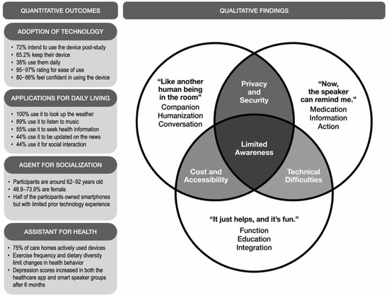 - McCloud, R.; Perez, C.; Bekalu, M.A.; Viswanath, K. Using Smart Speaker Technology for Health and Well-Being in an Older Adult Population: Pre-Post Feasibility Study. JMIR Aging 2022, 5, e33498. [Google Scholar] [CrossRef]