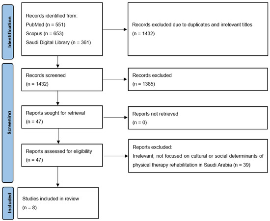 Studies were selected according to predefined PICO inclusion and exclusion criteria (Table 1) to ensure the focus remained on culturally relevant, peer-reviewed evidence from Saudi Arabia and comparable contexts. The Population (P) of interest included adults in Saudi Arabia, and where relevant, the wider Gulf/Arab region, who were engaged in or eligible for physical therapy and rehabilitation services. The Intervention (I) of interest was the adoption and utilization of modern rehabilitation and physical therapy practices. The Comparison (C) was not a formal control group but rather traditional cultural norms, beliefs, and practices that may influence rehabilitation adoption (e.g., gender roles). The Outcomes (O) of interest included reported barriers and enablers to rehabilitation adoption, with emphasis on how sociocultural realities shaped access, engagement, and acceptance of services. No restrictions were placed on the type of articles included due to the limited number of available studies.