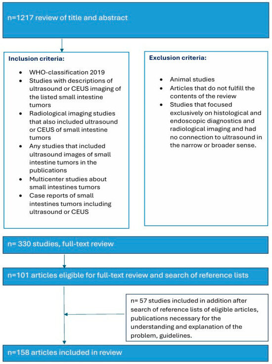 We have based our classification of the various tumors in the small intestine on the 2019 WHO classification. The literature search and analysis were performed specifically for US characteristics of small intestine tumors. PubMed was the database in which entries were searched until 7 June 2025. The keywords and binary operators used are listed in brackets. A total of 3156 titles were reviewed. The abstracts were reviewed, and suitable articles were selected for further analysis. Similar articles on PubMed database were also checked for relevant abstracts: (small intestine adenocarcinoma OR small bowel tumor OR small intestine neuroendocrine tumor OR small intestine lymphoma OR small intestine mesenchymal tumor OR small intestine GIST OR Jejunum GIST OR small intestine leiomyoma OR small intestine Vanek’s tumor OR small intestine inflammatory myofibroblastic tumor OR small intestine lipoma OR secondary small intestine tumors OR small intestine melanoma) AND (Ultrasound OR Ultrasonography OR CEUS) (Figure 1). Further additions were made during the peer review process.