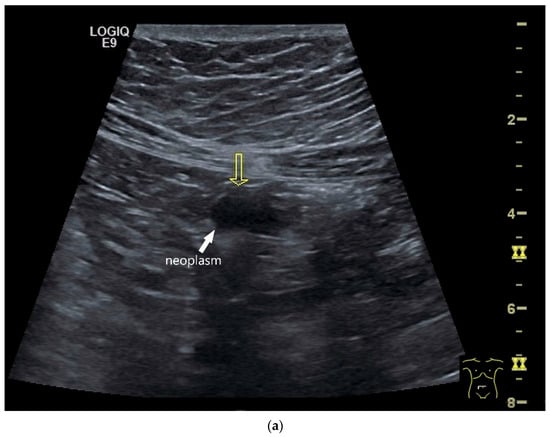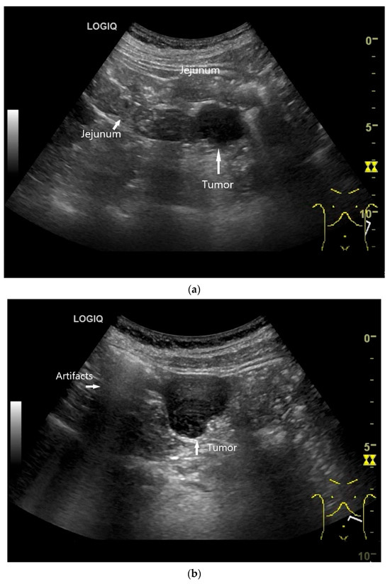 - Wu, S.; Yu, H.; Liu, Y.; Zhou, H.; Zhou, Y. Small bowel adenocarcinoma of the jejunum detected by double contrast enhanced ultrasound: A case report of a novel ultrasound modality. Front. Oncol. 2024, 14, 1288041. [Google Scholar] [CrossRef]