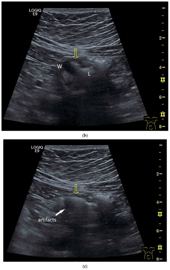 NEN in the ileum: an approximately 14 mm hypoechoic nodular tumor is visible (a). Subsequently, peristalsis reveals a hypoechoic wall thickening (W) and hyperechoic luminal reflex (L) (b) and, finally, causes the tumor to be obscured by the luminal contents and dorsal artifacts (c). The region of the tumor is marked with a yellow arrow in all three images.
