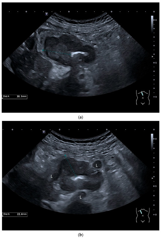 Adenocarcinoma in the duodenum. Significant hypoechoic wall thickening (between the markers) with narrowed lumen reflexes (a). The tumor has a slightly polycyclic border on the outside (a,b). Several tumor-suspicious, round, hypoechoic lymph nodes (L) are visible in the paraduodenal region (b).