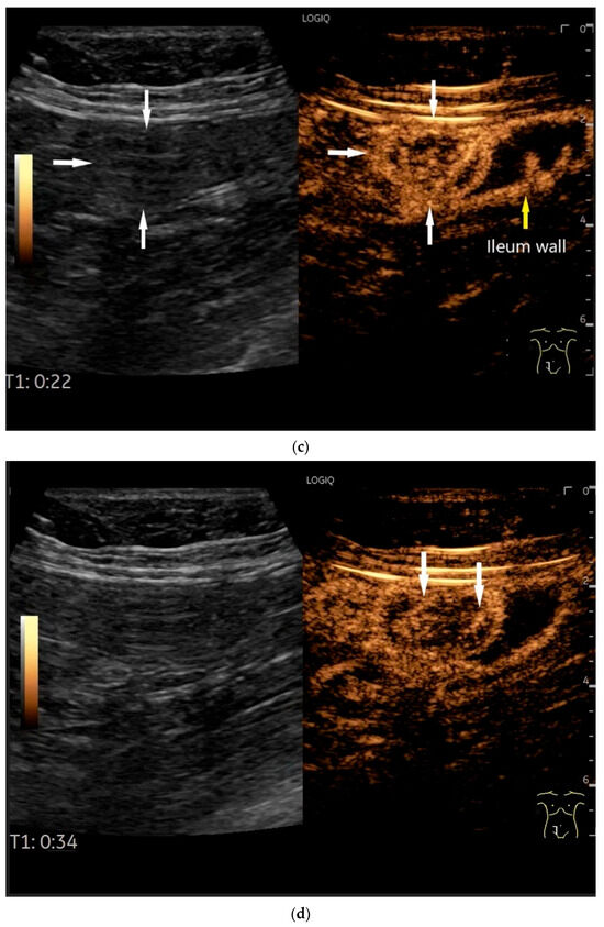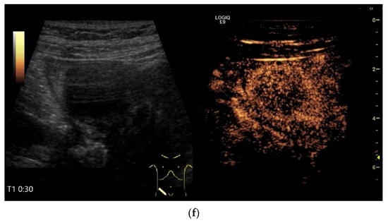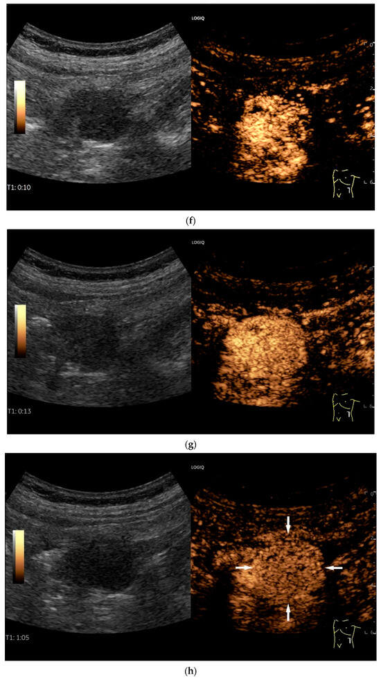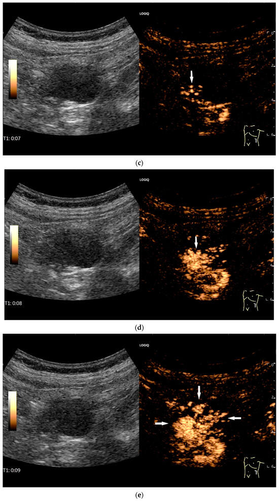 On US, small intestine NEN appear as small focal hypoechoic wall thickenings with a pseudo nodular appearance or as hypoechoic nodular lesion. They are usually small tumors. Adjacent pathological lymph nodes may appear in the mesentery. The tumors extend from the submucosa and may extend into the mesentery via the lamina muscularis propria [90,91,92,93,94,95,96]. NEN are usually well vascularized. Color Doppler imaging (CDI) can show irregular macrovessels in the tumor. Case reports showed that small intestine NETs are hyperenhanced on CEUS [91,92,94,95,96,97] (Figure 7 and Figure 8). Further diagnostics include CT and DOTATOC-PET.