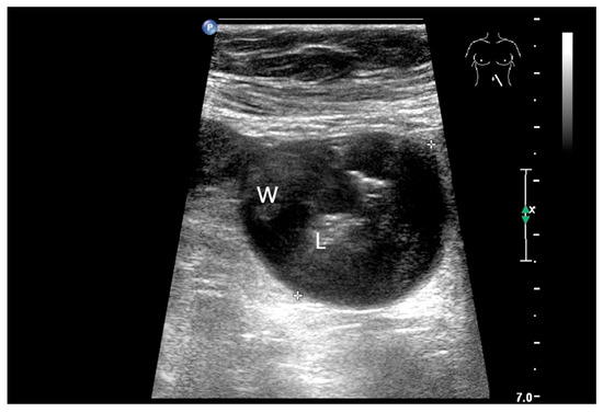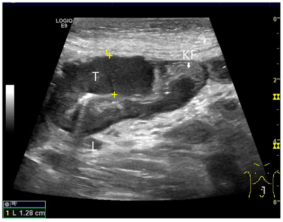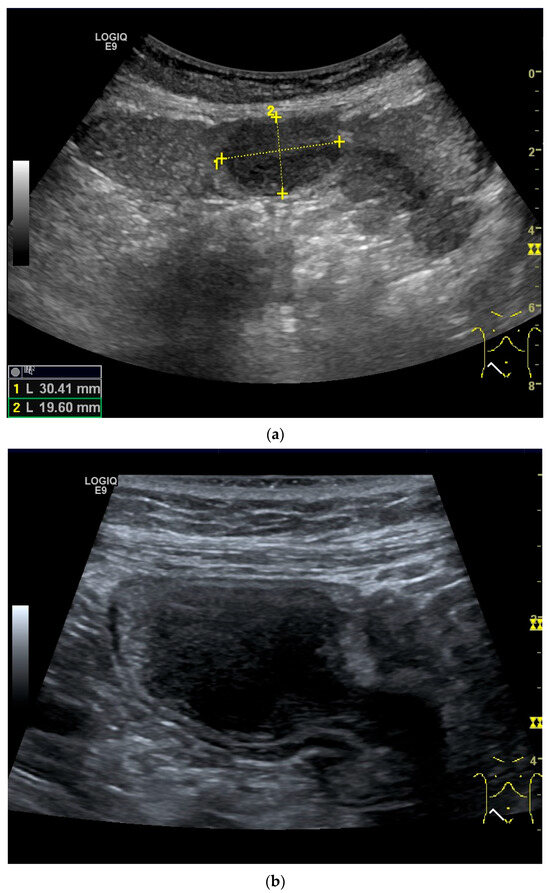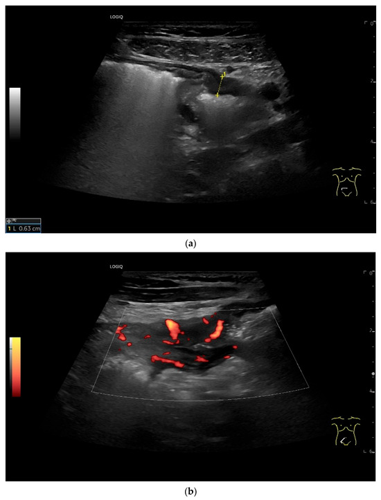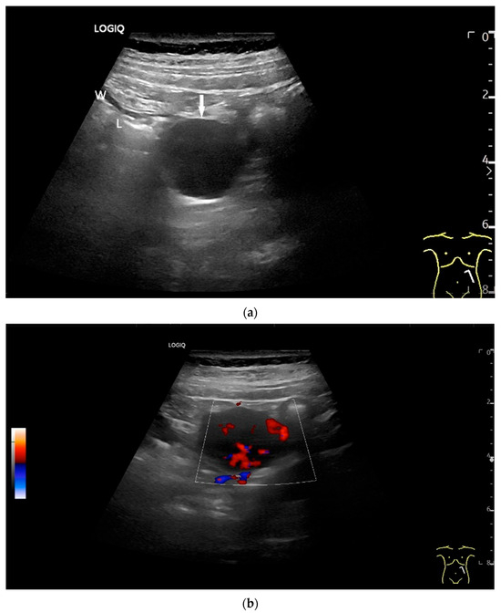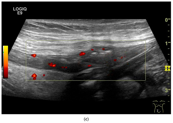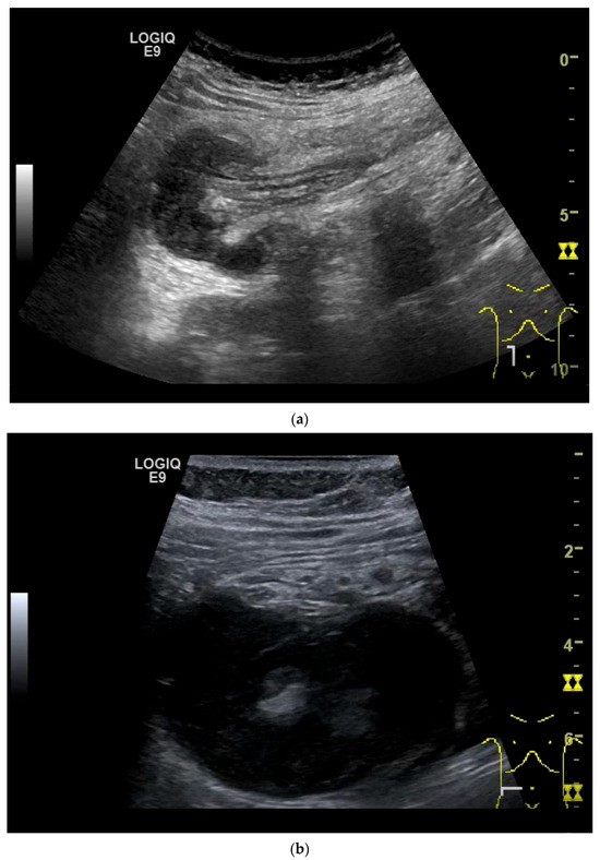 Due to the pronounced hypoechoic wall thickening with compressed central hyperechoic lumen reflex, there are comparative descriptions of the lymphoma manifestations in US as “doughnut sign” [112], “bull’s eye”, ‘target’ or “pseudo kidney” sign [110,113].