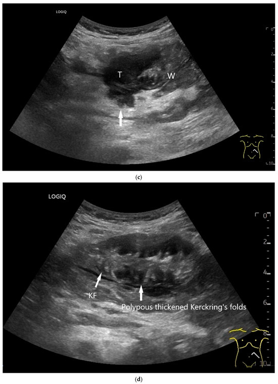 A common feature of small intestine lymphoma is a very pronounced wall thickening with marked hypoechogenicity, accompanied by enlarged lymph nodes. However, there are also focal circumscribed polypoid nodular changes or thickening of the mucosa and submucosa, which are mainly detectable endoscopically and are more difficult to delineate with cross-sectional imaging. The appearance of lymphomas in the small intestine depends on the extent of the different subtypes in the intestinal wall. The extent also depends on the stage of the disease (Figure 9 and Figure 10). Görg et al. [114] described the various manifestations of lymphoma in the gastrointestinal tract (including the small intestine) as mucosa-associated, transmural segmental, transmural circumferential, transmural nodular, and transmural bulky disease [114].