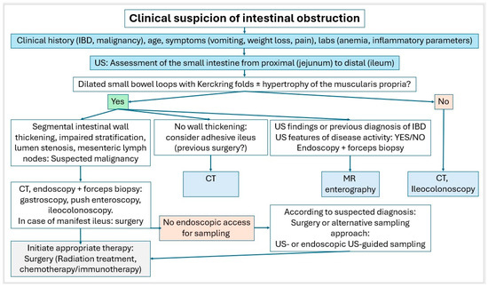 - Maccioni, F.; Rossi, P.; Gourtsoyiannis, N.; Bezzi, M.; Di Nardo, L.; Broglia, L. US and CT findings of small bowel neoplasms. Eur. Radiol. 1997, 7, 1398–1409. [Google Scholar] [CrossRef]