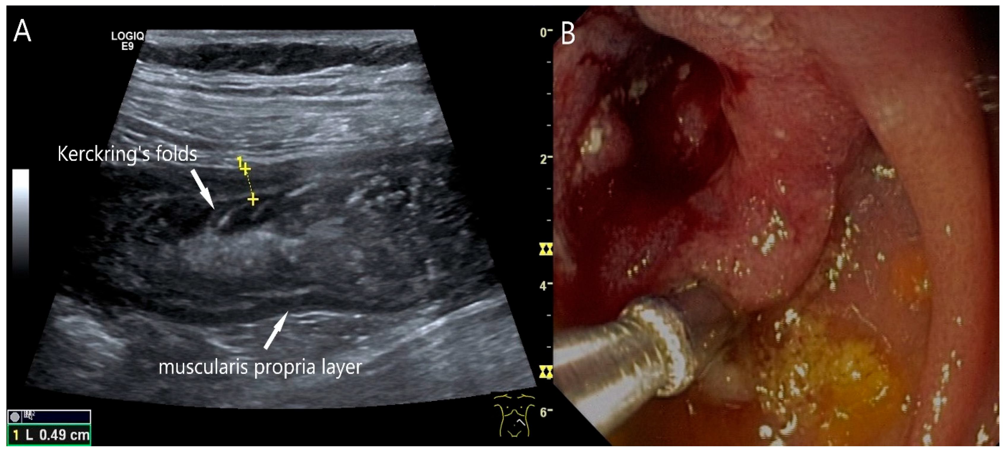 - Zhongcheng, L.; Dongting, C.; Biyao, W.; Xinyu, L.; Qin, G. Application value of small intestinal endoscopic ultrasonography for protruding lesions of the small intestine. Surg. Endosc. 2025, 39, 2902–2910. [Google Scholar] [CrossRef]
