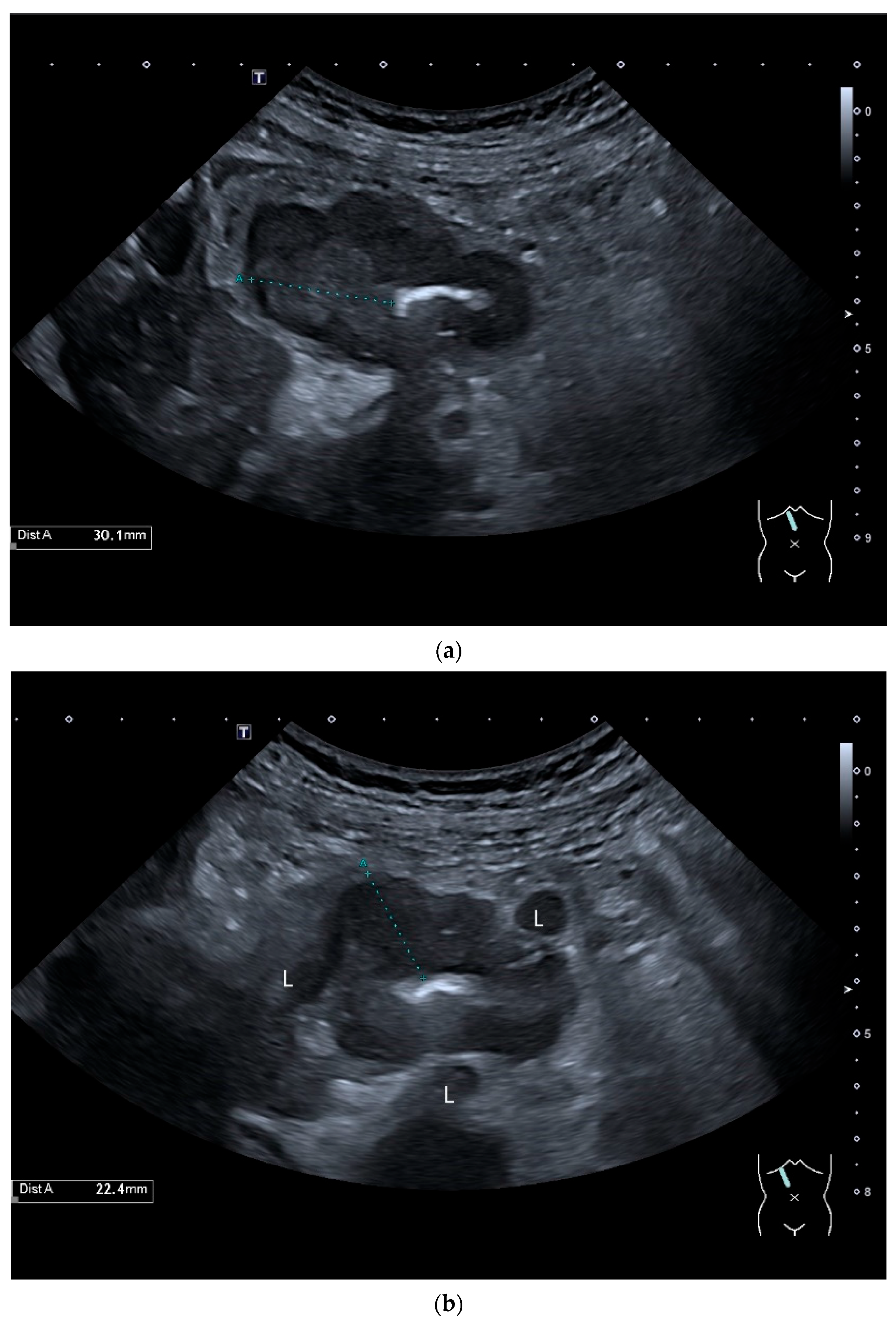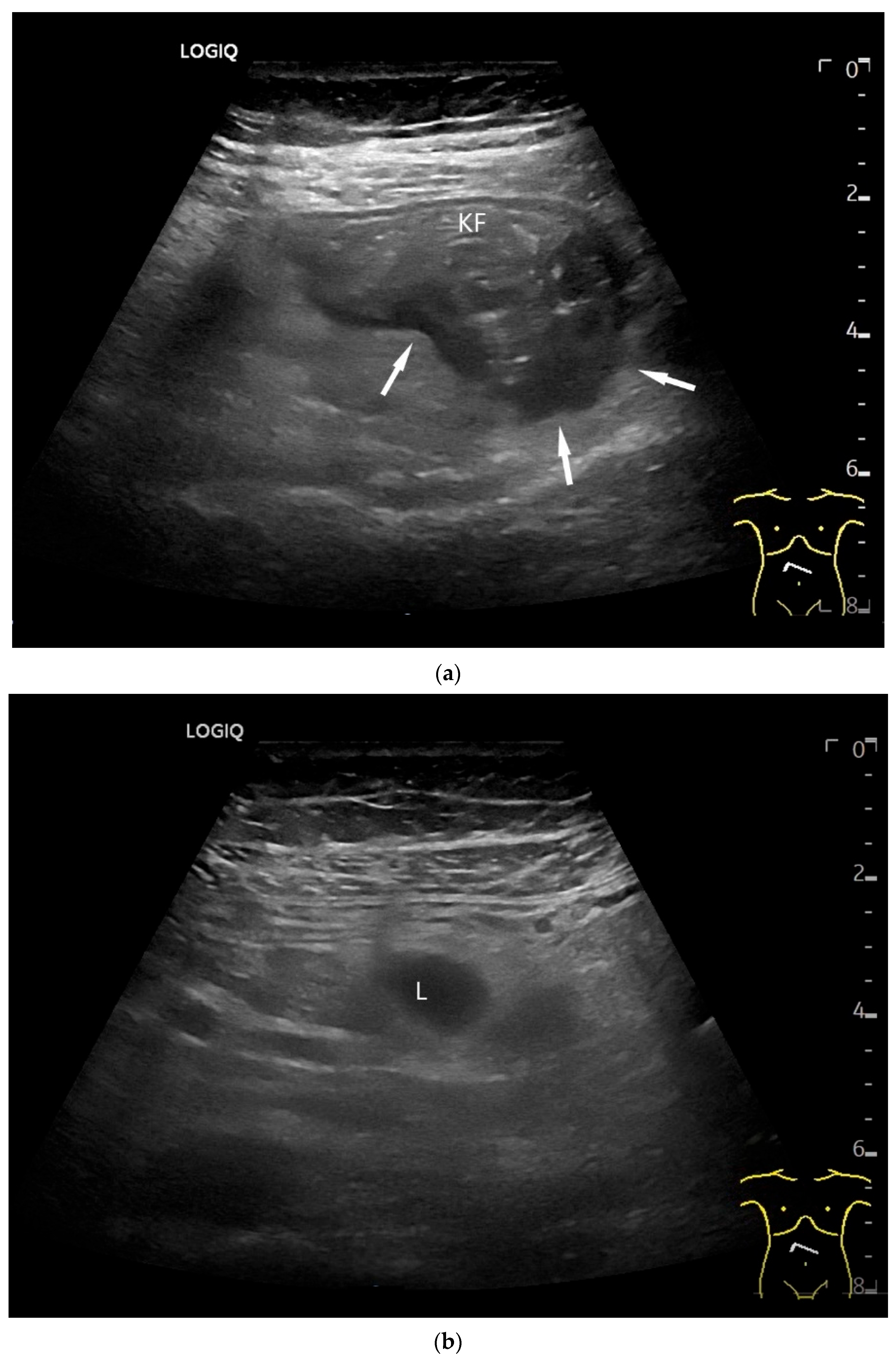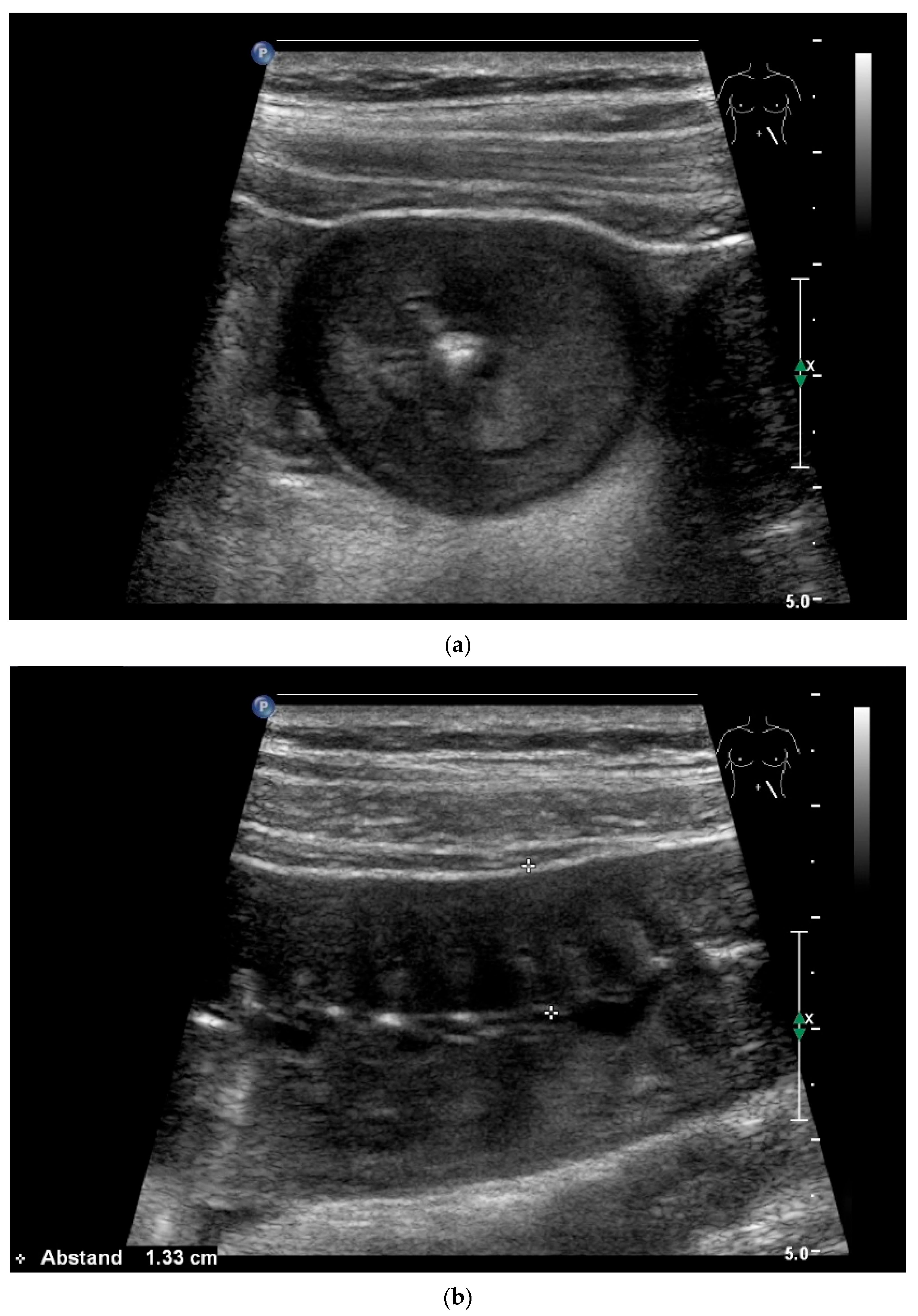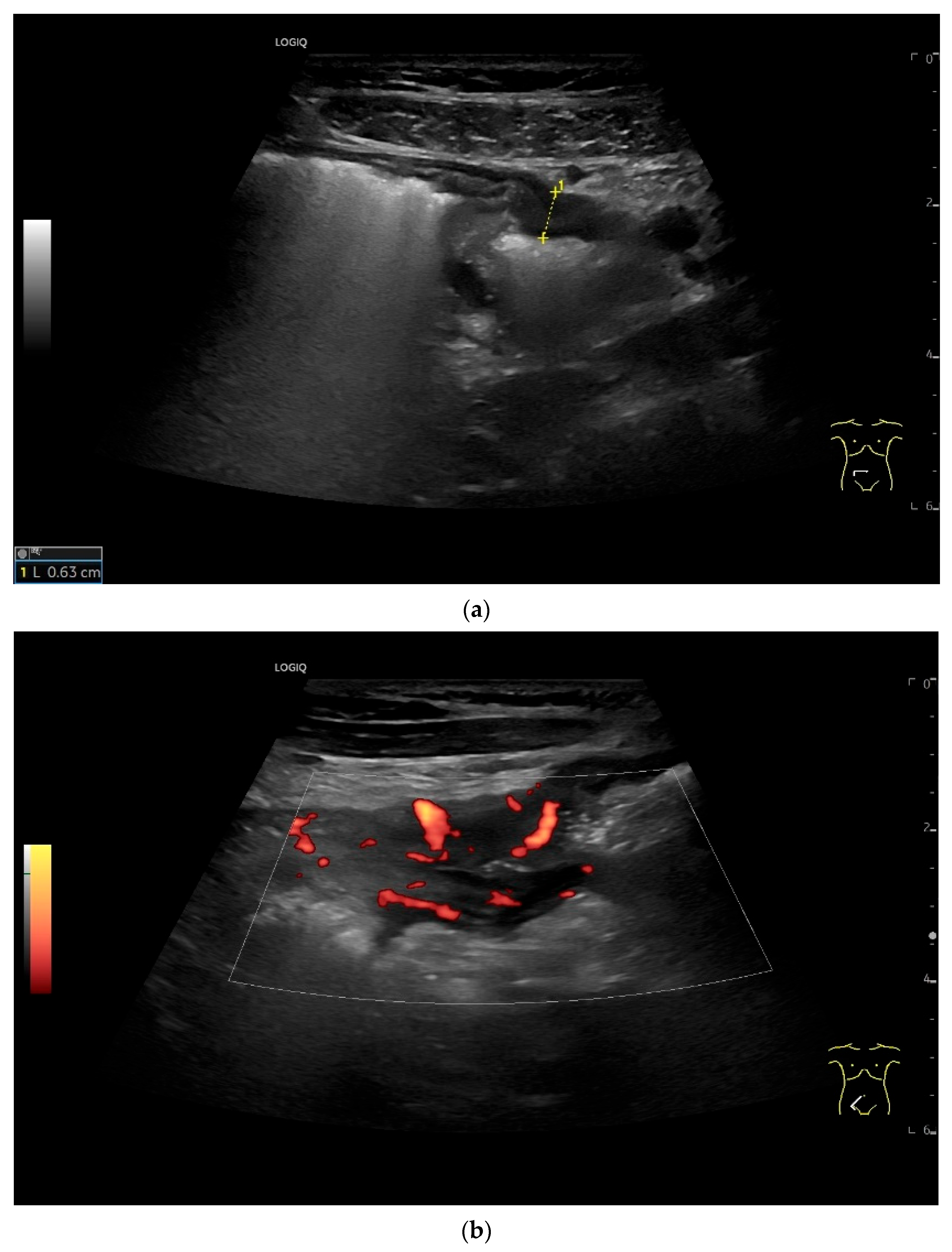 - Möller, K.; Fischer, P.; Gilja, O.H.; Gottschall, H.; Jenssen, C.; Hollerweger, A.; Lucius, C.; Meier, J.; Rogler, G.; Misselwitz, B.; et al. Gastrointestinal Ultrasound: Measurements and Normal Findings—What Do You Need to Know? Dig. Dis. 2025, 43, 300–335. [Google Scholar] [CrossRef]