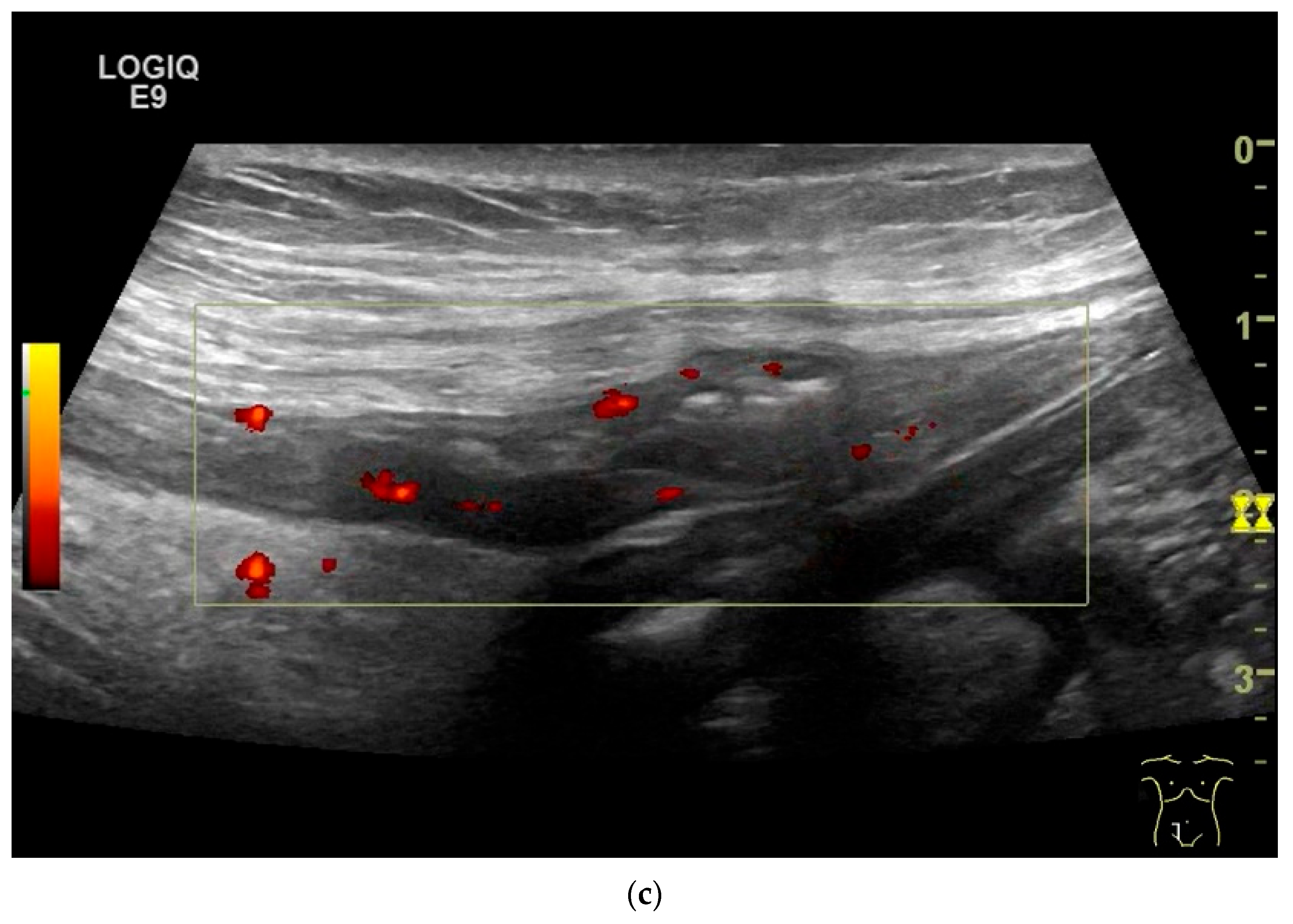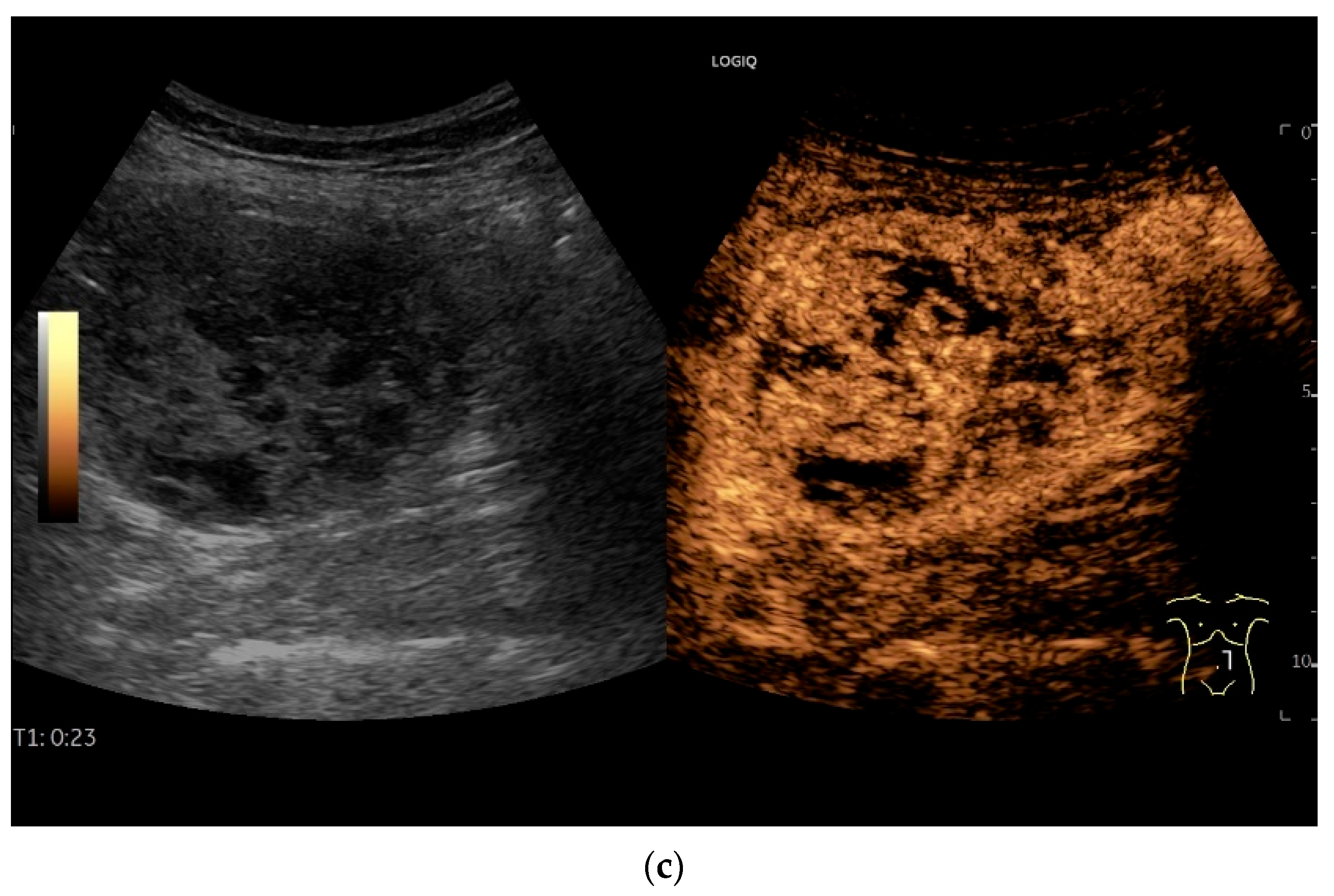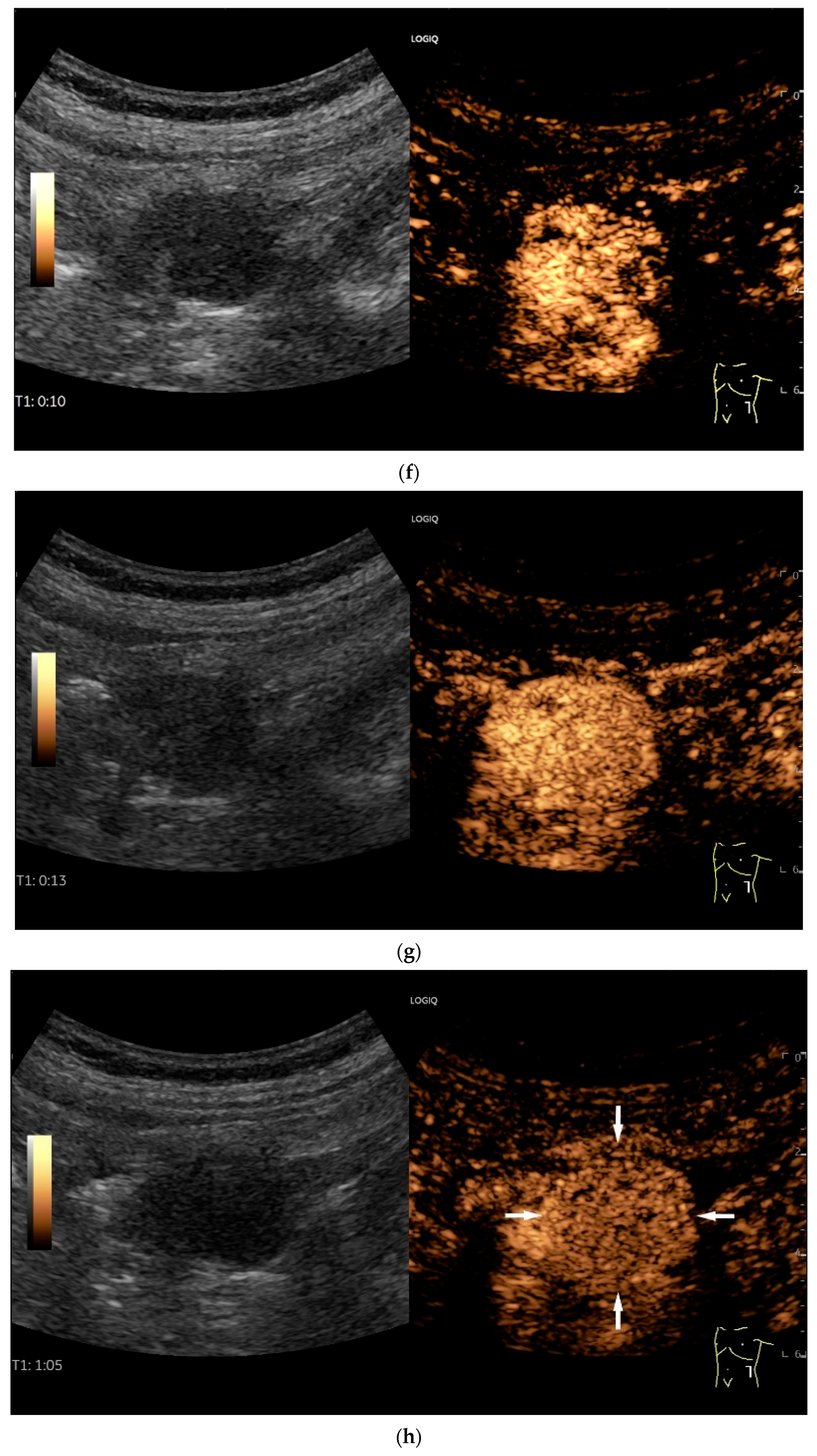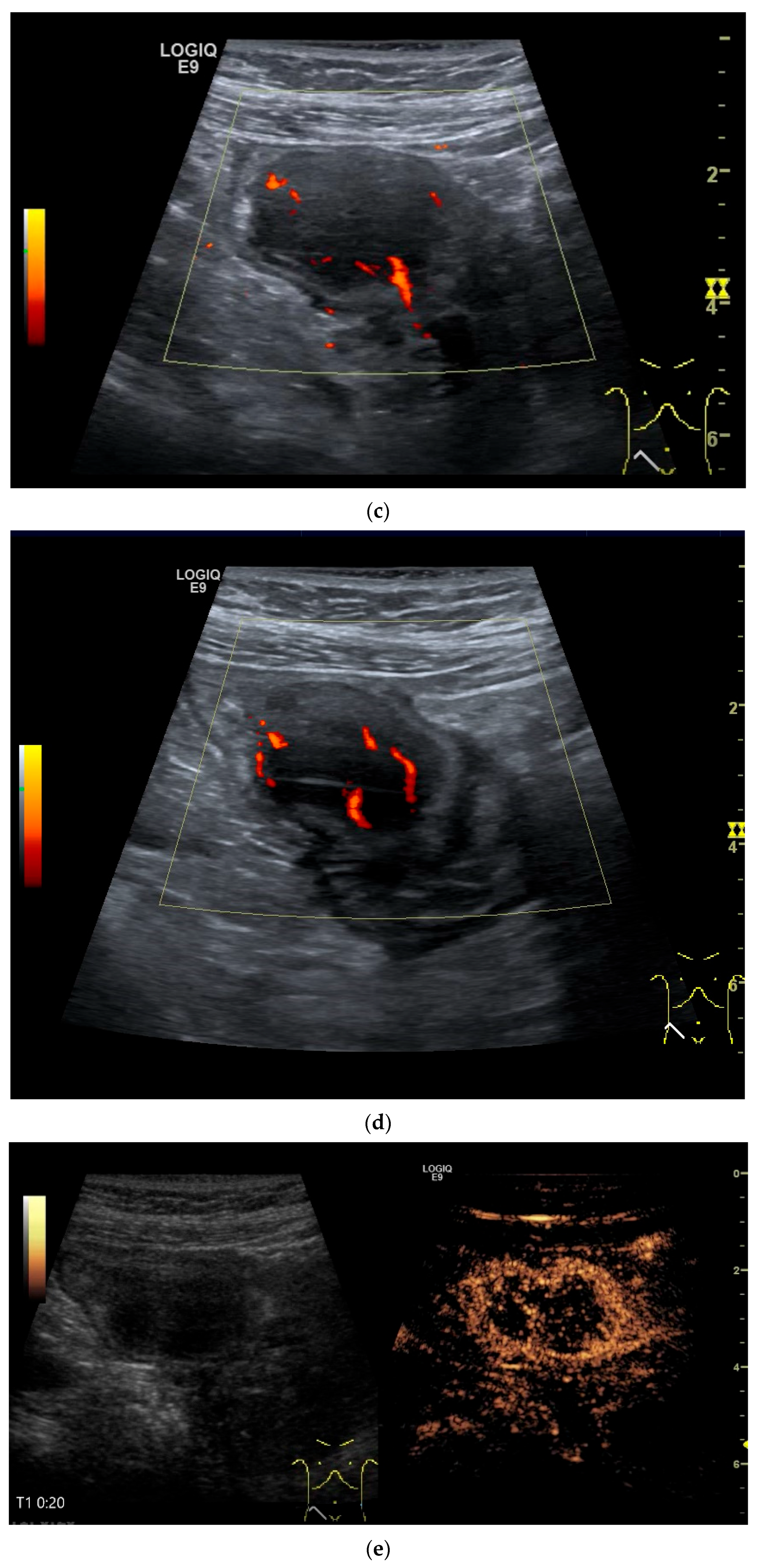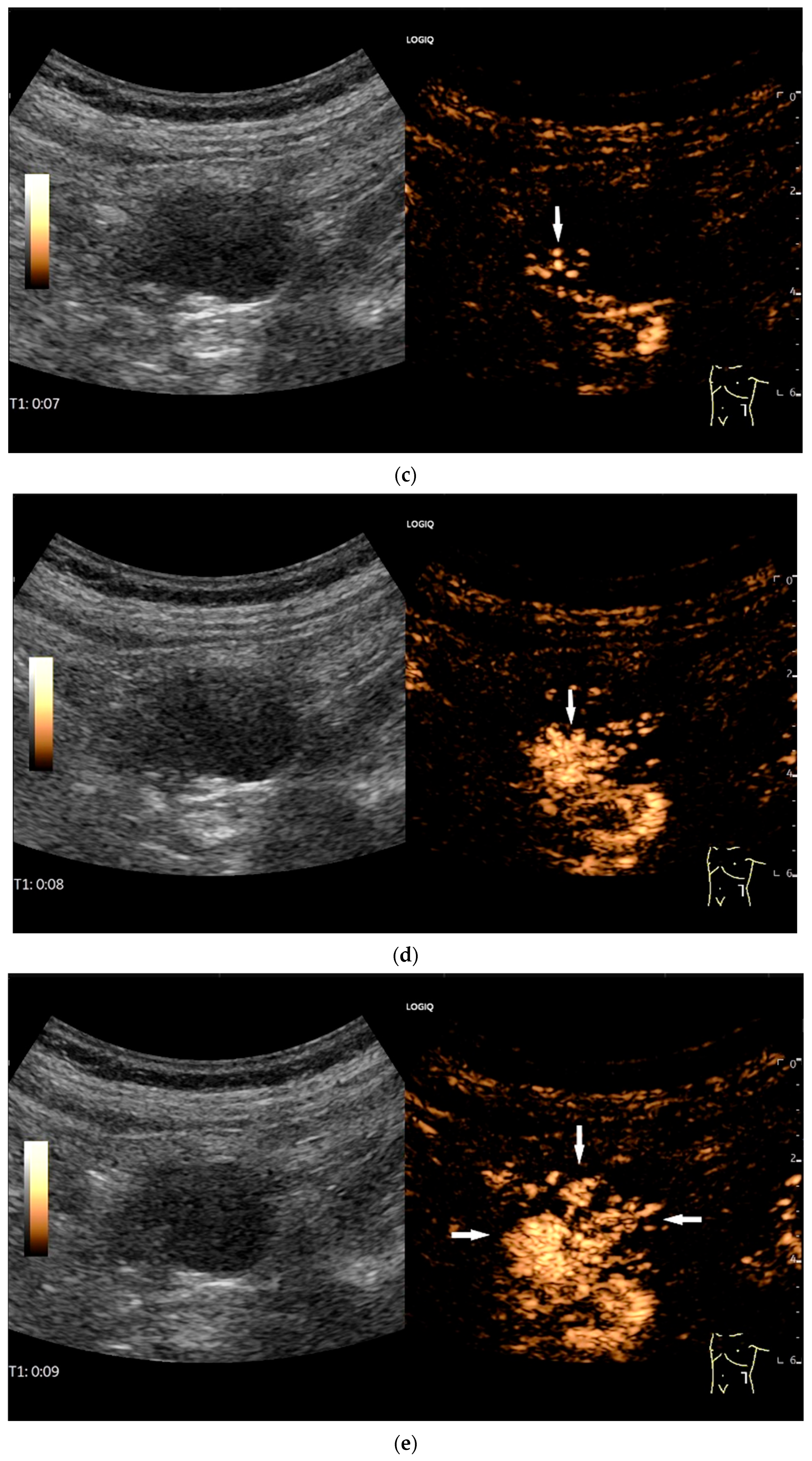 - Sidhu, P.S.; Cantisani, V.; Dietrich, C.F.; Gilja, O.H.; Saftoiu, A.; Bartels, E.; Bertolotto, M.; Calliada, F.; Clevert, D.A.; Cosgrove, D.; et al. The EFSUMB Guidelines and Recommendations for the Clinical Practice of Contrast-Enhanced Ultrasound (CEUS) in Non-Hepatic Applications: Update 2017 (Short Version). Ultraschall Med. 2018, 39, 154–180. [Google Scholar] [CrossRef]