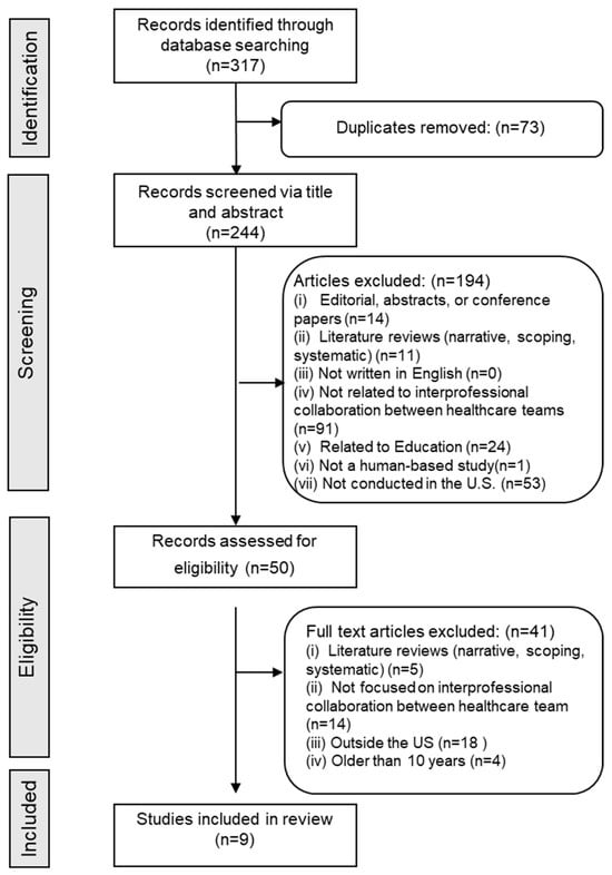 The PRISMA-ScR flow diagram (Figure 1) summarizes the article selection and screening. A total of 317 titles and abstracts were initially screened. After removing duplicates, 244 unique articles remained. These were reviewed, resulting in the exclusion of 194 articles for the following reasons: 14 were editorials, abstracts, or conference papers; 11 were literature reviews; 91 did not focus on interprofessional collaboration among healthcare teams; 1 was not based on human studies; 53 were conducted outside the U.S.; and 24 were related to education.