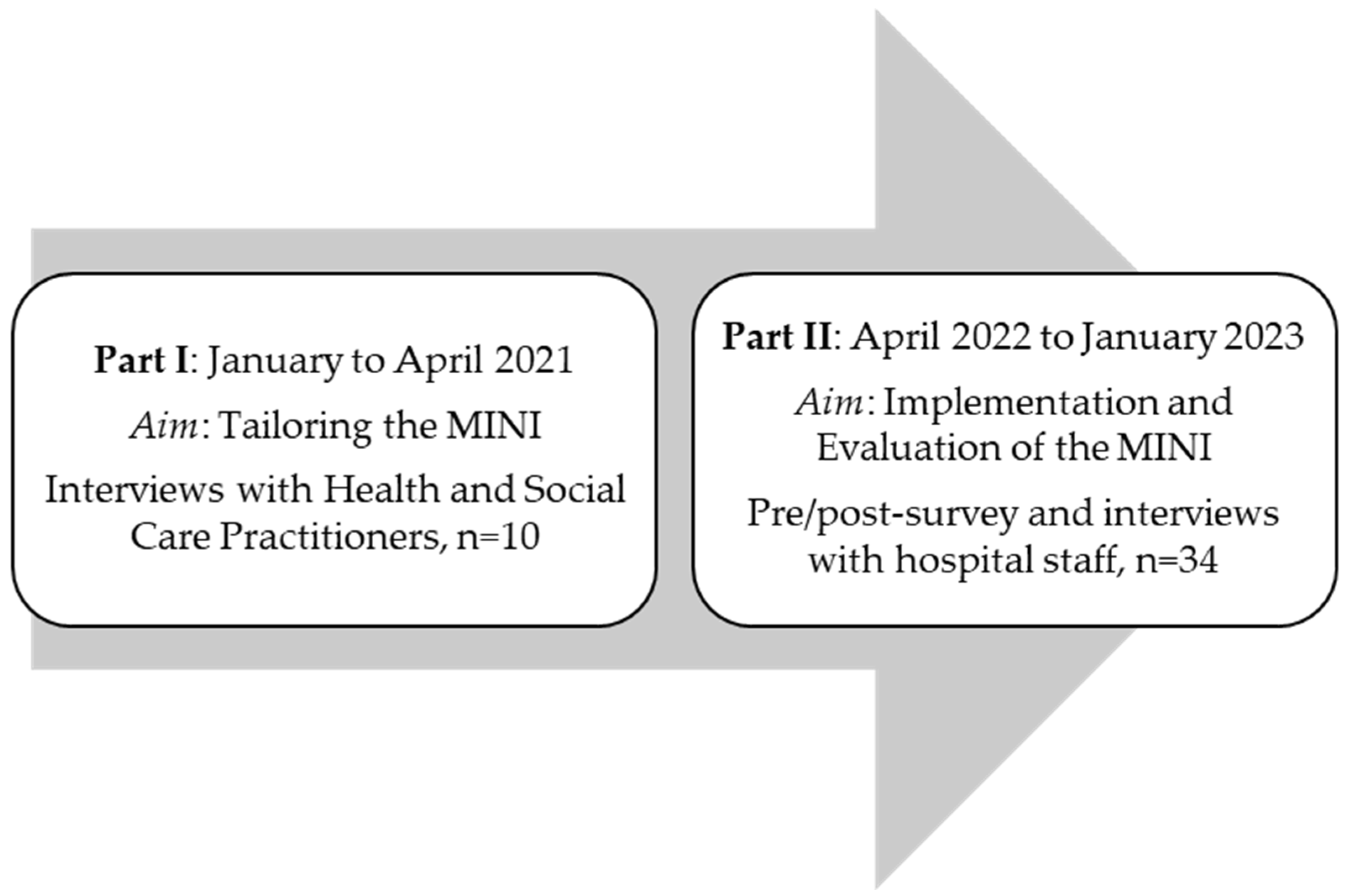 A distinction is made between two groups of participants (see Figure 1). The first group consists of those who were interviewed to tailor the intervention to the specific inpatient settings (I). The second group consists of university hospital staff who received the intervention, including a training session and subsequent application, and were later evaluated (Phase II). The participants in part I were health and social care practitioners (HSCPs) providing care for patients in their last year of life. These practitioners were sampled from January to April 2021 and were recruited using a purposive sampling strategy. The participants in part II were hospital staff from two hospital wards at the University Hospital Cologne. These included the gynecology ward, including its outpatient clinic, and an internal medicine ward. Most of the patients were treated for illnesses related to oncology and nephrology. The hospital staff had agreed to attend a Minimally Invasive Intervention (MINI) training. These participants were sampled from April 2022 to January 2023. Information regarding the training was disseminated through the hospital’s newsletter and through announcements by the research team and senior physicians.