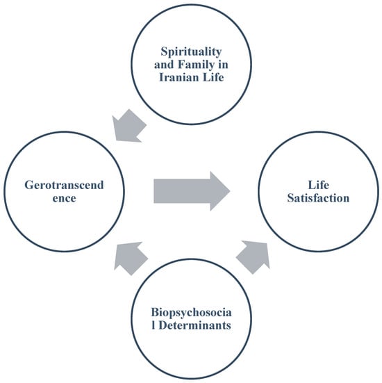 Although Tornstam’s theory of gerotranscendence provides a valuable framework for understanding positive psychological development in late life, its empirical validation has predominantly emerged from Western cultural contexts []. This presents a significant gap, as the pathway to and expression of gerotranscendence are likely deeply mediated by cultural norms, spiritual beliefs, and social structures. The present study seeks to address this gap by examining gerotranscendence within the unique socio-cultural fabric of Iran, a representative Middle Eastern society []. Iranian culture is characterized by a rich tapestry of Islamic and Sufi spiritual traditions, strong intergenerational family bonds, and collectivistic values that emphasize familial duty and respect for elders. These elements may profoundly shape how older adults reconfigure their relationships with the self, others, and the cosmos—the core dimensions of gerotranscendence []. Therefore, this research is not merely an application of the theory in a new setting, but an investigation into how its universal principles is articulated through the specific lenses of spirituality, family, and community in the Iranian context, thereby contributing to a more cross-culturally nuanced understanding of successful aging.