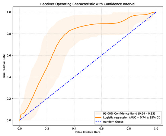 The LR model produces raw probabilities of an SCD occurring in a specific patient. By varying the classification threshold from 0 to 1, true positive and false positive rates can be computed at each threshold, generating the ROC curve. This allows the evaluation of the model’s discriminative ability. The model achieved an AUC-ROC score of 0.74 (95% CI: 0.64–0.83), with the corresponding ROC curve shown in Figure 1. These results outperform similar studies that used LR for the same purpose. Although recent AI studies on SCD risk stratification typically achieved an AUC-ROC value in the 0.76–0.81 range, they used more complex models and, in most cases, images or ECG signal details. This suggests that the performance of AI models trained solely on routinely collected clinical data is comparable to more technically demanding approaches relying on advanced imaging or ECG processing. The 95% confidence interval of 0.64–0.83 indicates some uncertainty in the model’s predictive performance, suggesting that while the true AUC is likely to reflect at least moderate discriminatory ability, further validation on larger or independent datasets is needed to confirm the results.
