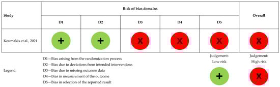 - Sterne, J.A.C.; Savović, J.; Page, M.J.; Elbers, R.G.; Blencowe, N.S.; Boutron, I.; Cates, C.J.; Cheng, H.-Y.; Corbett, M.S.; Eldridge, S.M.; et al. RoB 2: A revised tool for assessing risk of bias in randomised trials. Br. Med. J. 2019, 366, l4898. [Google Scholar] [CrossRef] [PubMed]