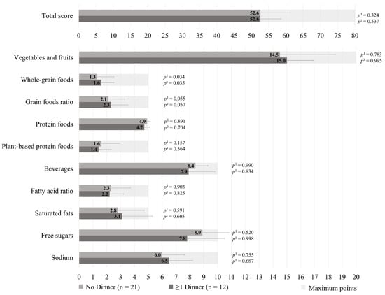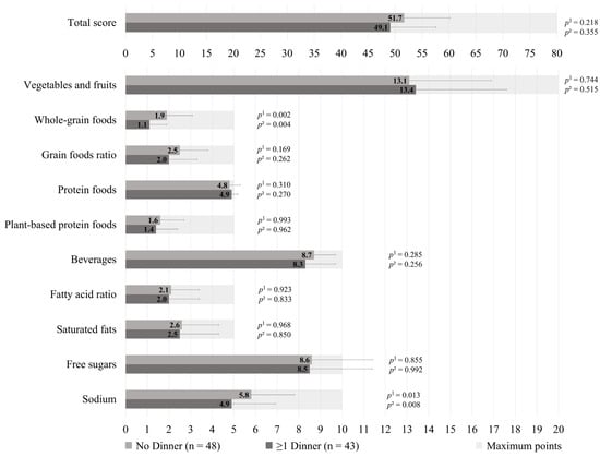The HEFI-2019 score was similar between those who prepared ≥1 dinners per week vs. no dinner using pre-prepared or processed foods among GDM+ mothers (49.1 ± 8.5 vs. 51.7 ± 8.5, respectively; p = 0.218), as shown in Figure 1. More specifically, the first group adhered less to the “Whole-grain foods” (1.1 ± 0.8 vs. 1.9 ± 1.2, respectively; p = 0.002) and “Sodium” (4.9 ± 2.0 vs. 5.8 ± 2.0, respectively, p = 0.013) components of the HEFI-2019 score compared to the latter. Among GDM− mothers, those who prepared ≥1 dinners per week vs. no dinner using pre-prepared or processed foods had a similar HEFI-2019 score (52.6 ± 6.0 vs. 52.6 ± 8.7, respectively; p = 0.324), as shown in Figure 2. Conversely to GDM+ mothers, GDM− mothers who prepared ≥1 dinners per week using pre-prepared or processed foods adhered more to the “Whole-grain foods” (1.6 ± 0.9 vs. 1.3 ± 1.2, respectively; p = 0.034) component compared to those who prepared no dinner of this type. The HEFI-2019 results are also presented in Supplementary Table S3 for GDM+ mothers and in Supplementary Table S4 for GDM− mothers.