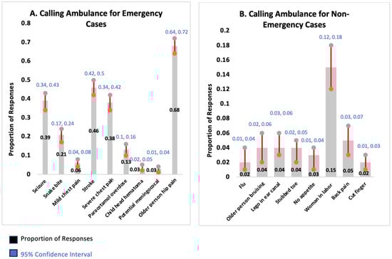 Proportion of responses with 95% confidence interval (CI) for ambulance services utilization across emergency (A) and non-emergency (B) cases.