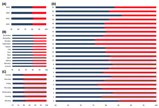 This figure illustrates the distribution of EMS responses to NHs (red bars) compared to those occurring outside NHs (blue bars). It shows the relative proportions of these responses over several dimensions. (A) Annual trends, (B) Monthly trends, (C) Weekly trends, (D) Hourly distribution. The figure highlights the proportion of EMS responses to NHs relative to the total number of responses, emphasizing the contribution of NH calls to the overall emergency workload.