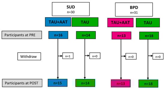 CONSORT for the recruitment of the two groups, animal-assisted treatment (TAU+AAT) and treatment as usual (TAU), separated for participants with substance use disorder (SUD) and participants with borderline personality disorder (BPD).