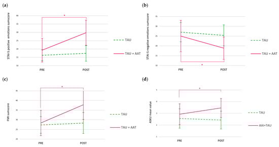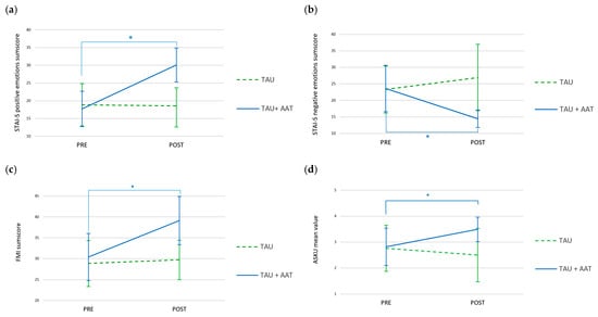 Values of positive (a) and negative (b) emotions sum scores (STAI-S), as well as mindfulness sum score (c) and self-efficacy expectancy mean value (d) over time (PRE vs. POST intervention) for both groups (TAU+AAT vs. TAU) among participants with BPD. *: significant time × group interaction and significant time effect in TAU+AAT in all four outcomes.
