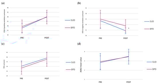 Values of positive (a) and negative (b) emotions sum scores (STAI-S), as well as mindfulness sum score (c) and self-efficacy expectancy mean value (d) over time (PRE vs. POST intervention) for both TAU+AAT groups (SUD vs. BPD). *: significant group effect in STAI-S negative emotions sum score.