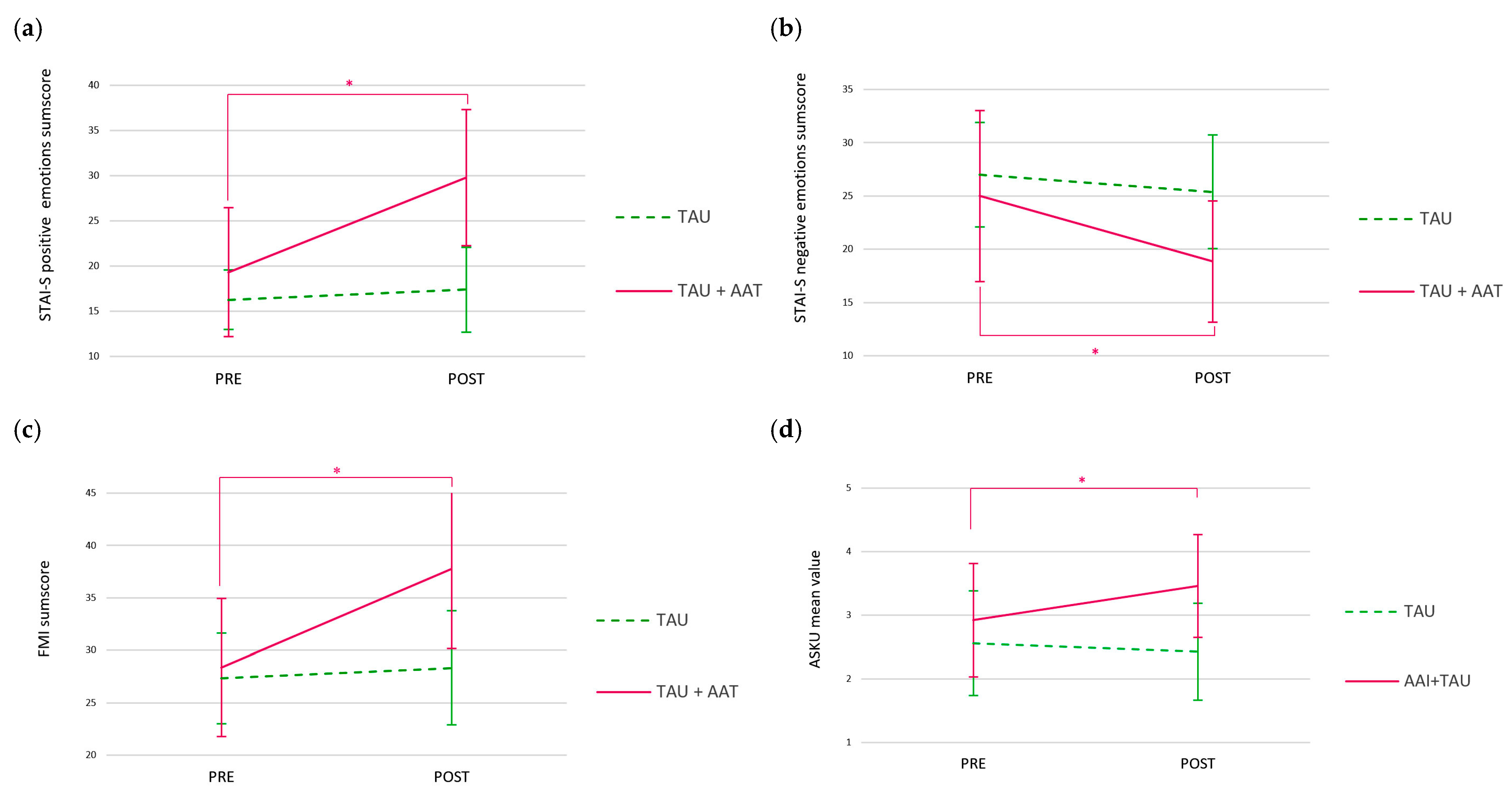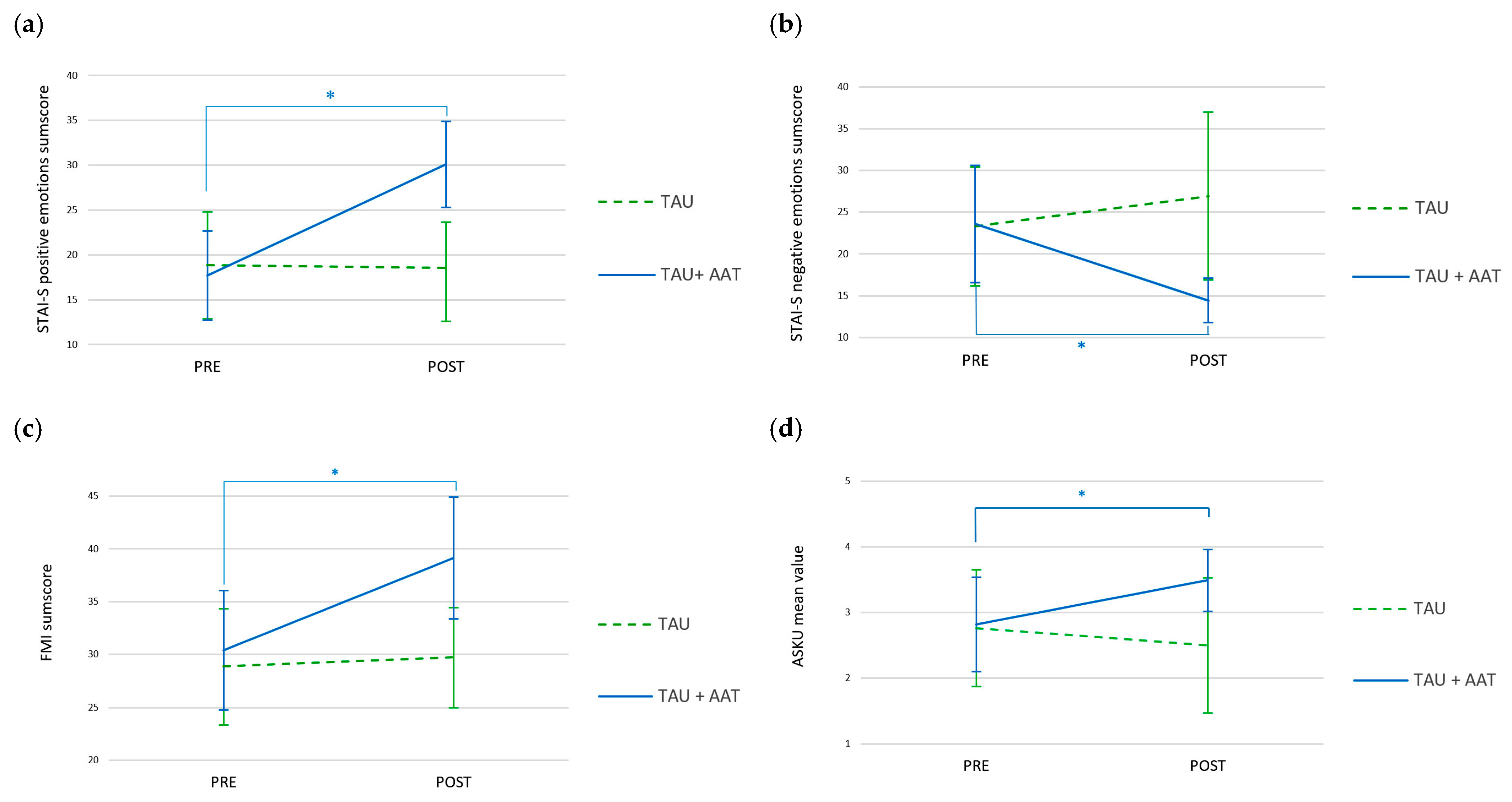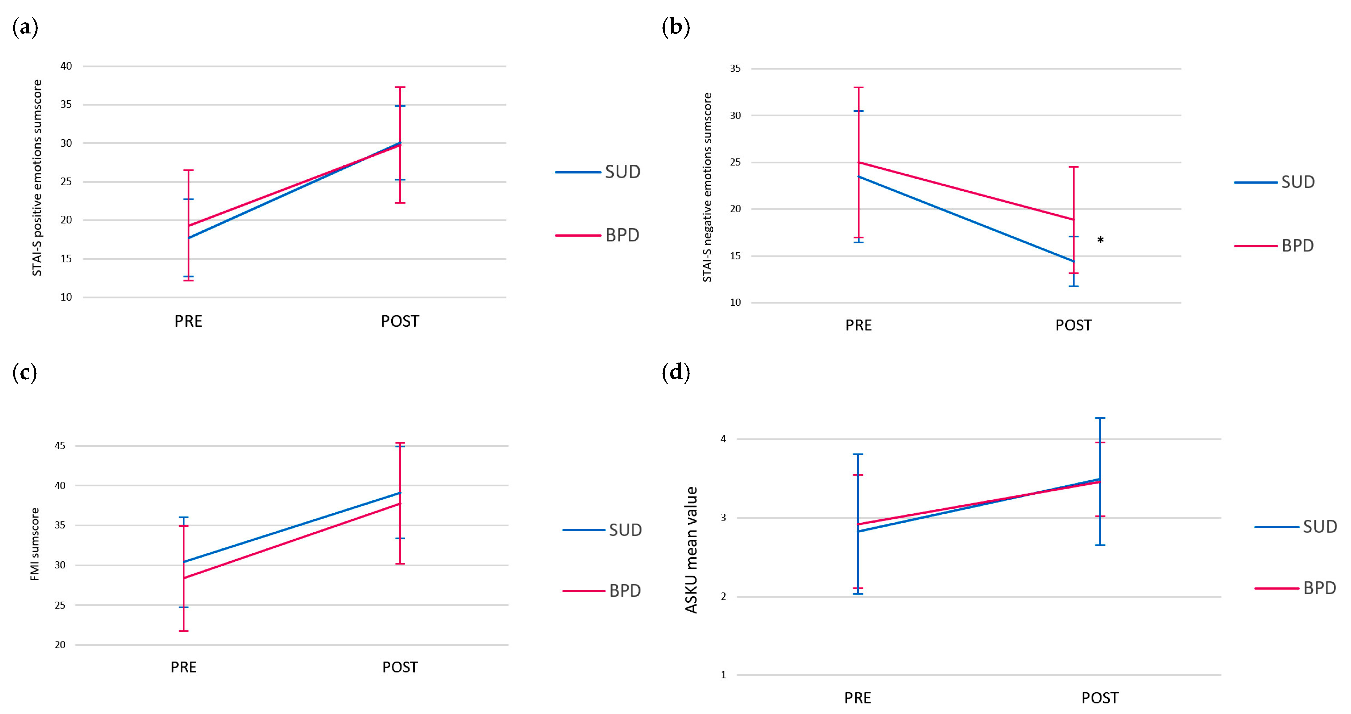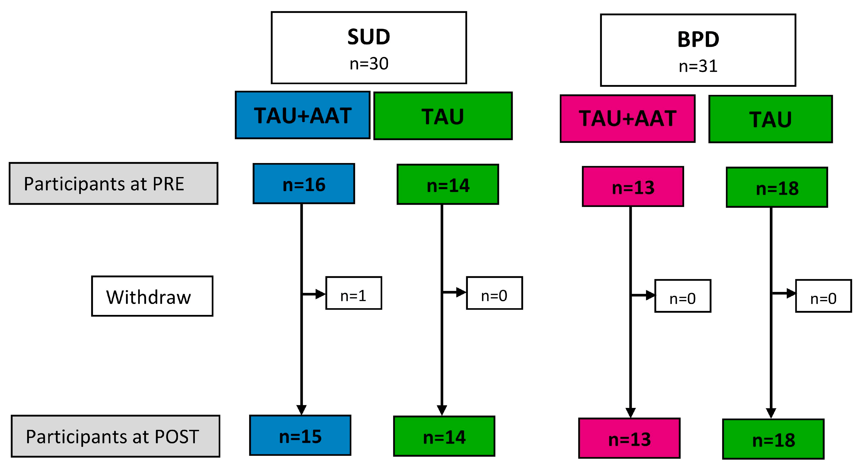 3.3. Question 3: Comparison of Participants with TAU+AAT in the Two Groups SUD vs. BPD