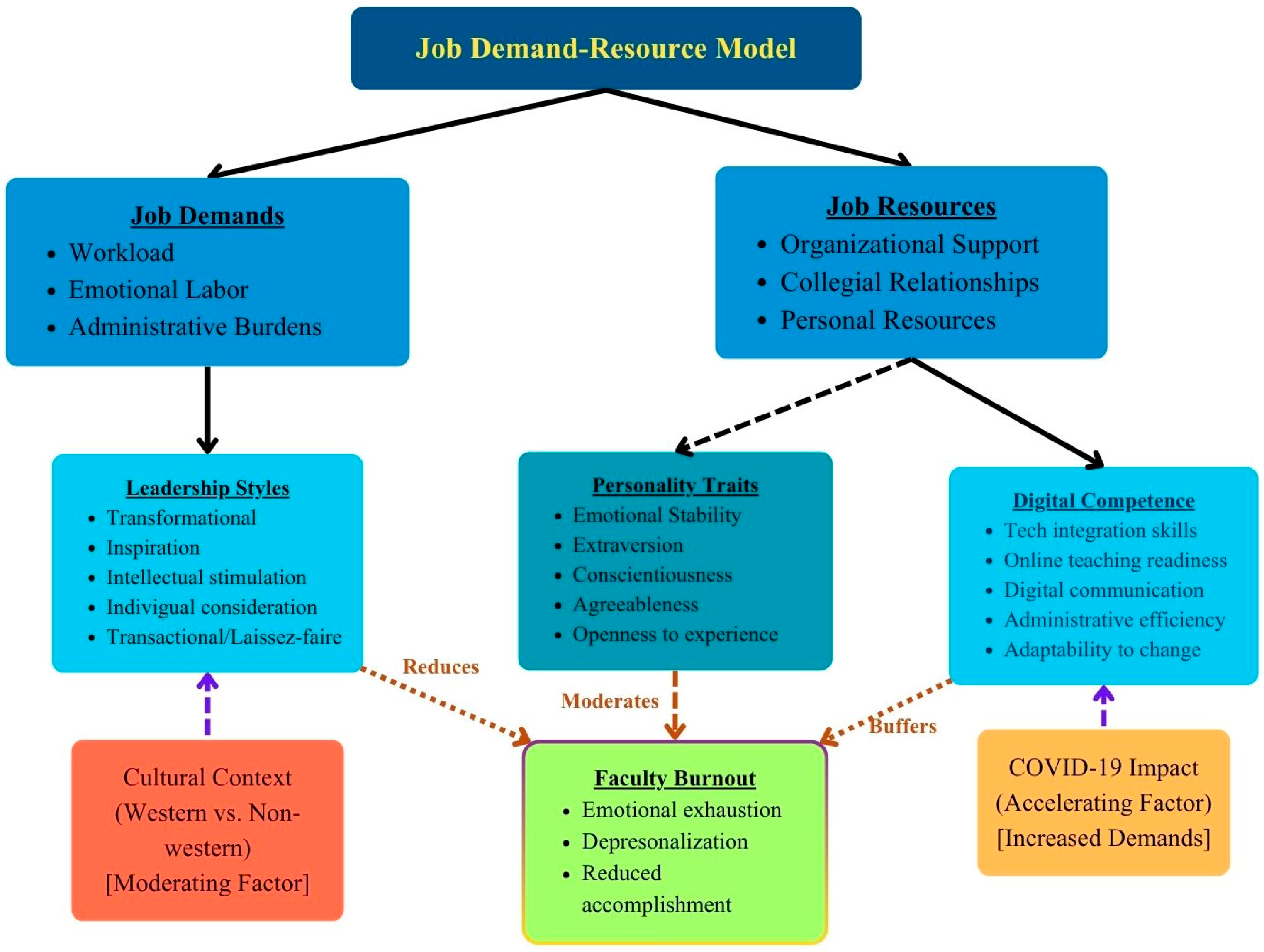 Leadership represents a critical organizational resource that can significantly influence faculty experiences of job demands and access to other job resources. Different leadership approaches create distinct work environments with varying implications for faculty wellbeing. Transformational leadership, characterized by inspiration, intellectual stimulation, individualized consideration, and idealized influence, has been associated with reduced burnout among healthcare professionals [11]. Conversely, laissez-faire leadership or highly directive approaches may increase burnout risk by failing to provide adequate support or by generating additional stressors [12].