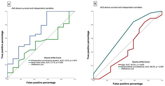 Exploratory receiver operating characteristic (ROC) curves for predictors of AUS device failure. Panel (a) ROC analysis of body mass index (BMI; AUC 0.713, p = 0.028) and preoperative incontinence duration (AUC 0.515, p = 0.874). Panel (b) ROC analysis of age (AUC 0.453, p = 0.625) and bulbourethral circumference (AUC 0.660, p = 0.097). These analyses suggest that higher BMI may have moderate discriminative ability for predicting device failure, whereas other variables showed limited predictive value. Results should be interpreted as exploratory and hypothesis-generating. This analysis is exploratory and data-driven; the threshold should not be interpreted for clinical decision-making without external validation.