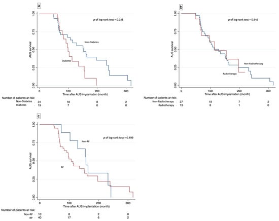 Kaplan–Meier Curves for Artificial Urinary Sphincter (AUS) Device Survival Stratified by Clinical Variables. Panel (a): Device survival according to diabetes status. Patients with diabetes showed significantly lower device survival than those without diabetes (p = 0.038, log-rank test). Panel (b): Device survival stratified by pelvic radiotherapy. No significant difference was observed between patients with and without radiotherapy (p = 0.945). Panel (c): Device survival according to surgical modality (radical prostatectomy [RP] vs. non-RP). No significant difference was noted between groups (p = 0.499).